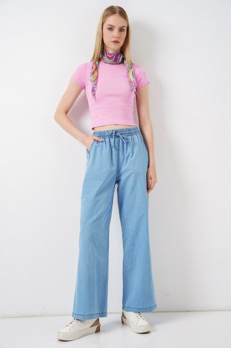 Kadın yüksek bel lastikli bağcıklı kot pantolon