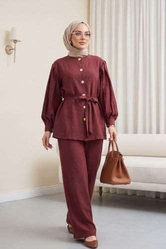 • Karpuz Kol Beli Bağcıklı Pantolonlu Lena Takım Mürdüm