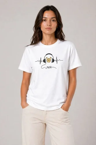 Müzik Temalı Baskılı Tişört Bisiklet Yaka Kısa Kol TShirt Beyaz