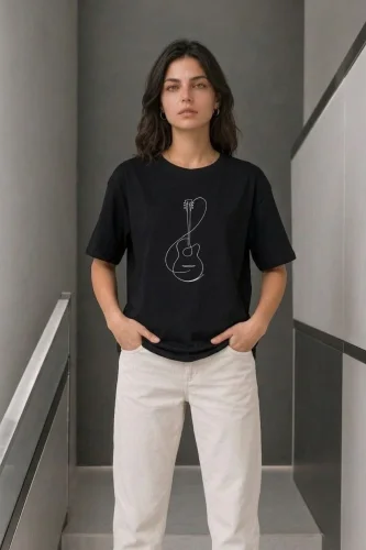 Minimal Gitar Baskılı Tişört TShirt Yazlık Kısa Kol Bisiklet Yaka TShirt Siyah