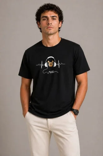 • Erkek Müzik Temalı Baskılı Tişört Bisiklet Yaka Kısa Kol TShirt Siyah